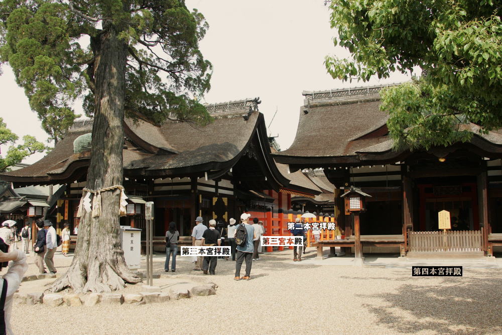 住吉大社は神功皇后ほか三神を祀る古社。参道を往き太鼓橋(反橋)をわたると奥から第一本宮、第二本宮、第三本宮が縦に並び、第四本宮が第三本宮の右手(南隣)に鎮座する。四社殿はそれぞれ孤立し、構造もほとんど同じ。妻入りの本殿に廻廊はなく板玉垣の外側を荒忌垣で囲み、四社殿を包む板玉垣の正面に四角の柱からなる住吉鳥居がある。拝殿は、第一本宮のが他の三つの拝殿よりやや大きく作られている。