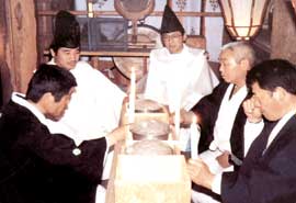 本宮の本殿は、飯盛山の山懐にあり流造(3間x2間)の銅版葺きである。元服式、かゆ占い、流鏑馬等々・・・近在の氏子の参拝が絶えない。かゆ占いは小正月の行事。福岡では筑紫神社等々においても伝えられている。流鏑馬は秋の例大祭に行なわれ、約400年の伝統がある。神事流鏑馬を伝承し、住吉神社、現人神社、香椎宮、志賀海神社等々の流鏑馬に奉仕する。拝殿脇に流鏑馬の銅像(写真上)が顕彰されている。