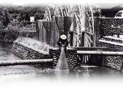 飛沫をあげ回る水車を不思議そうにみつめる幼児の手を握る老人は感慨深げである。最上流の菱野の水車は三連になっていて、一連ごとに大きさが異なる。三連中、一番大きな上部の水車は直径が4.8bもある。下部の小さなものは4b。取水量の配分が考慮されているのだろう。