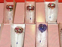■ 福岡の郷土玩具は多種多様であるが、放生会に並ぶ玩具の代表格はチャンポン(ビードロ)とおはじき(写真左)。博多ではビードロをチャンポン又はピンポンなどという。吹くと出る音を商品名としたものである。大小さまざまなものがあるが、浮世絵のビードロを吹く女を彷彿とさせるような綺麗に絵付けされた小さなものも並んでいる。今なおビードロが玩具として親しまれているところは、長崎と博多くらいであろう。おはじきの方は、絵柄がひとつとして同じものはなく、随分凝ったものである。もともと土でできていたようであるが、金属ないし特殊な樹脂を加工したものなど実用に耐える堅牢な素材が使用され、絵柄に素朴な美しさがあって人気がある。太宰府天満宮のウソドリ、崇福寺の絵馬、チャンポン、博多おはじき、博多独楽、瀬高のきじ車、英彦山のガラガラなど福岡にはよい玩具が多い。