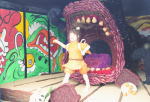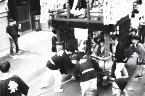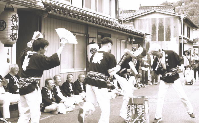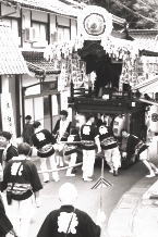 | 愛媛県八幡浜市保内の秋祭りに大鼓台をスピード豊かに引き回す行事がある。神様は荒事を好まれるようだ。小豆島の蒲団太鼓は差し上げ、横倒しにする。難波の生国魂神社の夏祭りは太鼓台を横転、逆転、錐もみ、差上げと大暴れするのが流儀。祭神もお喜びのことだろう。しかし保内や難波の太鼓台でバチを打つ氏子に荒事は通じないようだ。太鼓のリズムが乱れることはない。額田の締太鼓然り。軽やか打ち続けるこどもの手が休むことはない。 |
