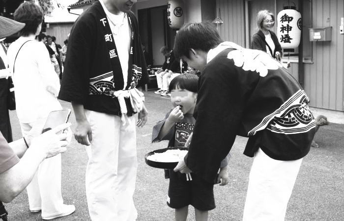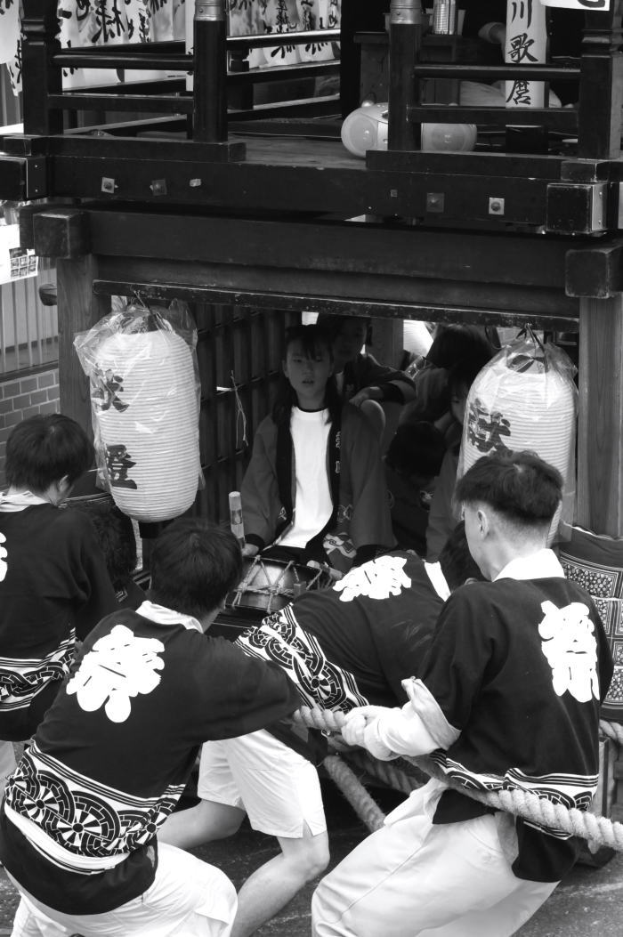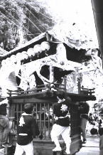 下町のダシが宮入り。神社はTの字を90度右倒しにしたような路地の角に鎮座する。人力で路地を左にカーブさせ、ダシは神社石段下まで移動。ダシを止め宮入り。