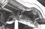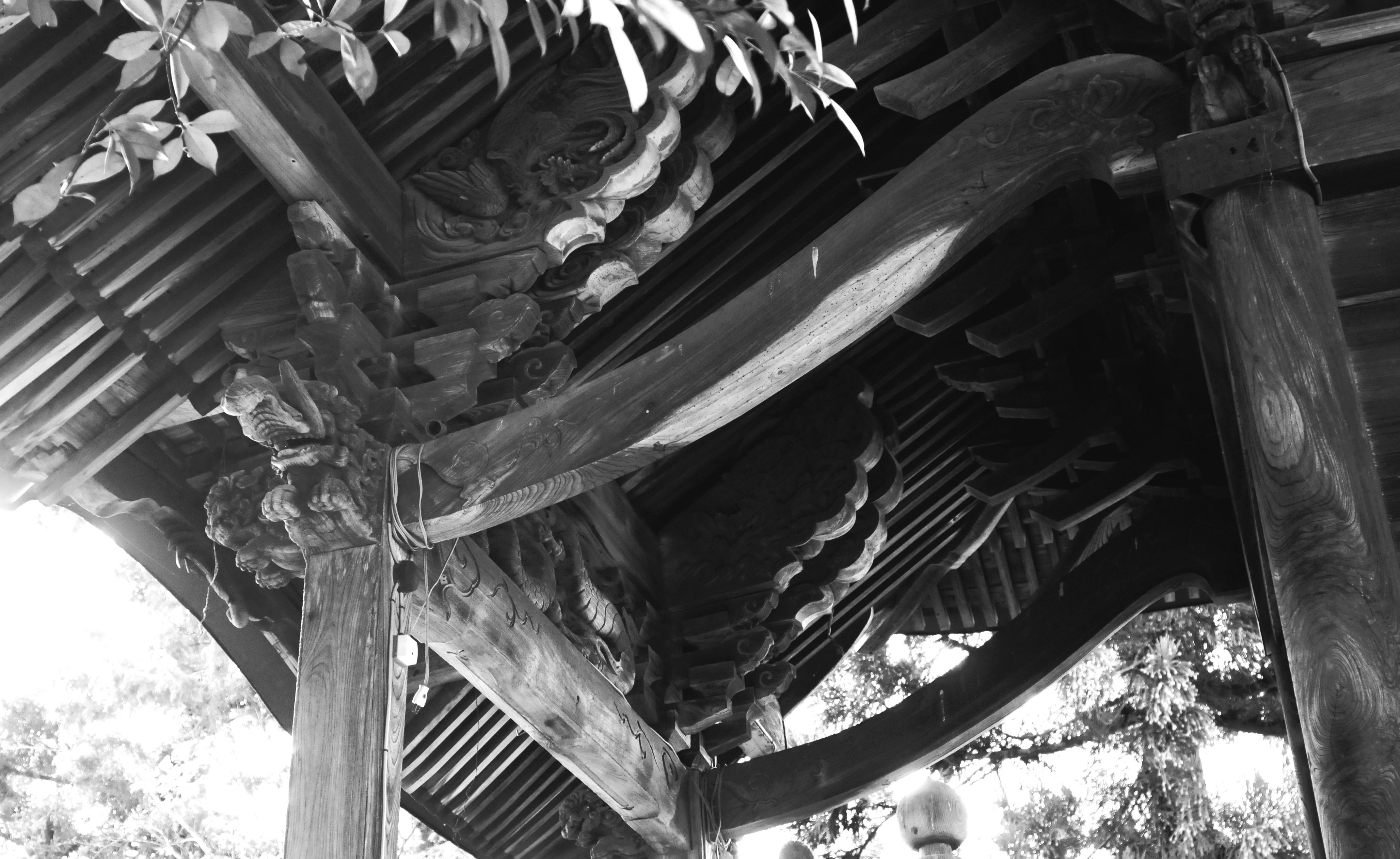 本殿の唐派風の兎の毛通しに鳳凰をしつらえ、その奥に宝珠を握った龍を配し邪気を払っている。向拝柱と貫が交わる左右に、阿吽の唐獅子と獏を配し、左右の二重の手挟に花鳥の彫り物が見える。彫り物(彫刻)は名工・中井権次(一統)の作品。 - 令和7年10月12日-