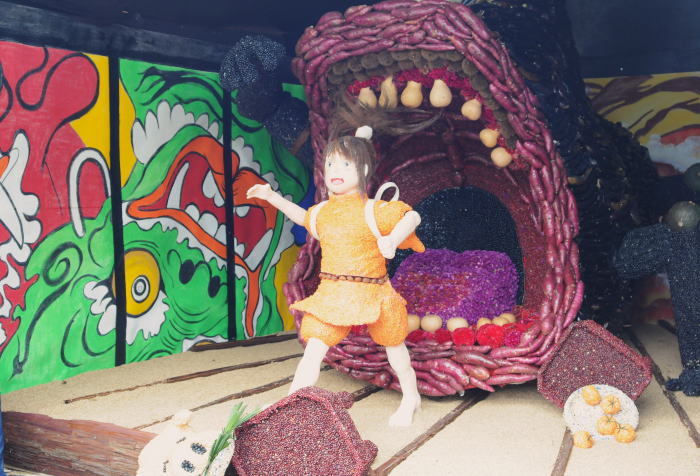 街通りの路地は4.5~5㍍。藩政期の風情が残る路地にダシ(山車)が行き、野菜や穀物の種などで作ったジオラマが道端に飾られている。