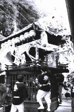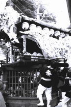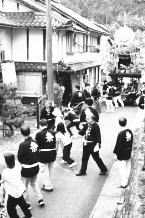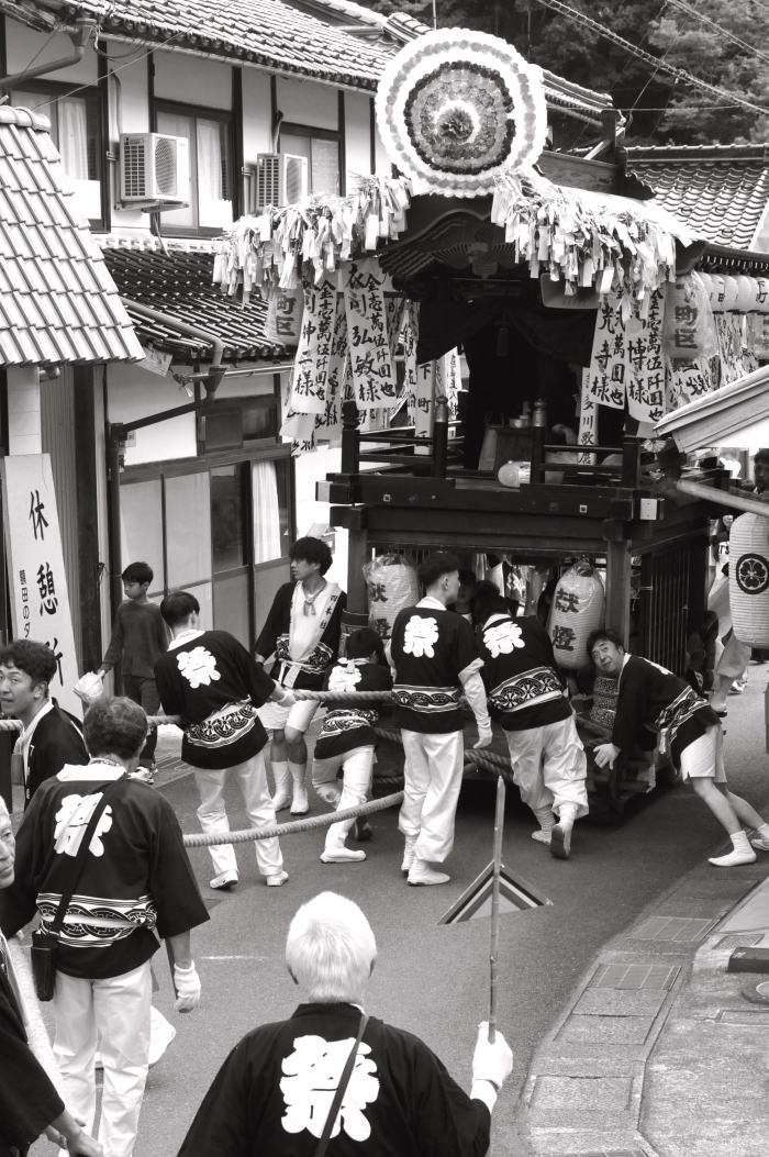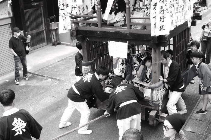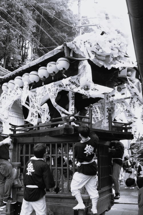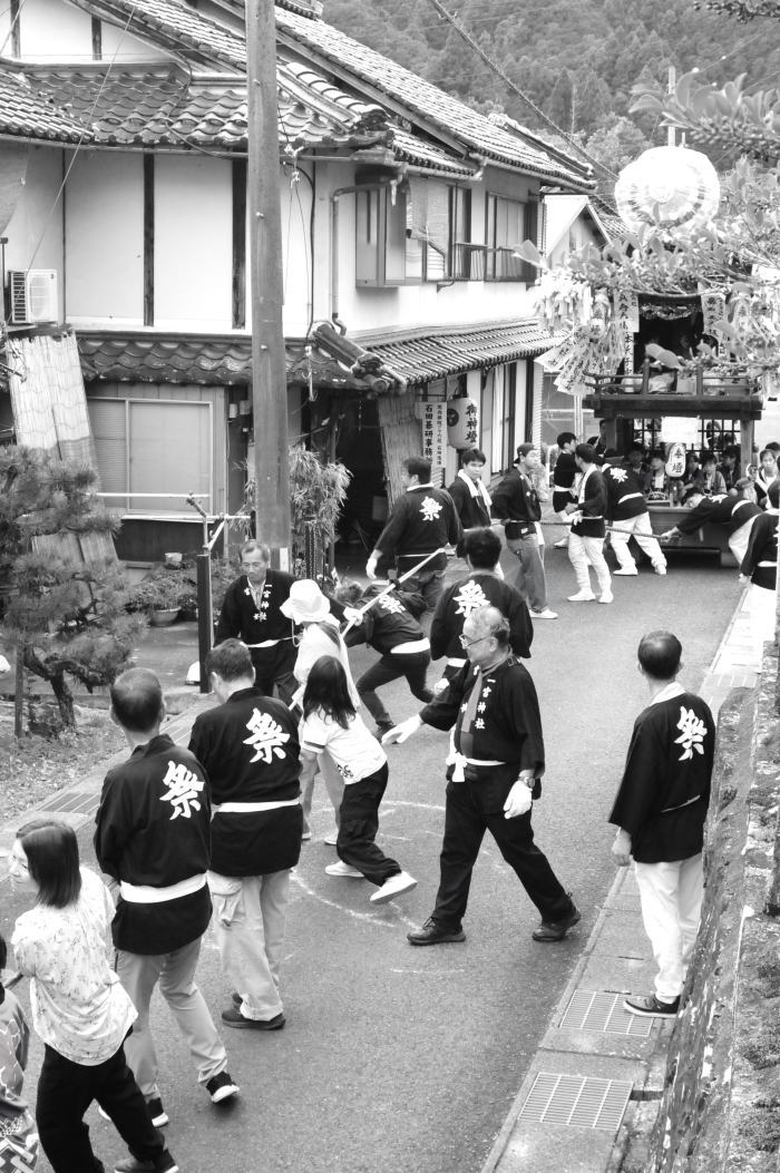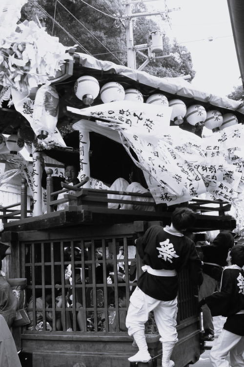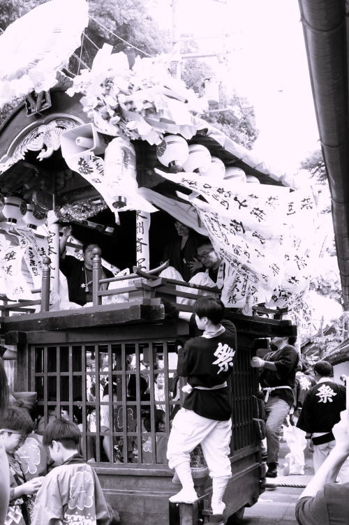 上町、下町の二基のダシがそれぞれの本拠から移動し、宮入りの道行が始まった。路地は狭い。つかず離れず、ダシの後を追い祭見物。