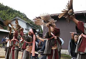 この日、奉納された曲はトビビラキ、ハグクミ(手で口をふさいで踊る)、オリワゲ(ササラオドリともいう)、テオドリ(ササラを使わない)の4曲(写真下)。都合30分ほどの踊。装束は藩政期のそれであるが浮流の影響が少なく、田遊びから芸能への脱皮期に生じた田楽の基本を映しているように思う。完成度等において田楽の白眉であろう。シャギリは宮入りや御旅所へ渡御の際、ササラ方が太鼓を抱え、太鼓方が長さ20aほどの細く小さなバチで曲を演じる行道芸で見かけたことのない稀有なものである。ビンザサラの起源は大宮神社のそれと同様、正慶元(1332)年と伝えている。−平成30年10月7日−