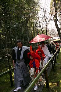 行列の並びは、先立、鉾、督殿(こうどの。練り衆の指揮者)、羯鼓(かんこ。神子・小鬼とも。2名。烏帽子を被り赤の長髪(シャグマ)をつけ、緋の小袖に四季模様の白袴をはき、羯鼓を胸にかける)、大鬼(白衣・白袴に緋の大袖に赤の長髪2名、黒の長髪2名。赤髪が太鼓、黒髪が鉦を持つ)、花傘(2基)、音頭取り(素襖着用)、囃方(素襖着用)の順。花傘は径約2メートルもある巨大なもの。天部に緋の帽額(もこう)をかけ、桜、椿、山吹、柳、若松を挿す(写真上)。傘の中に入ると無病息災が叶うと信じられ、光念寺の境内に傘が運び込まれると待ちかねた人々は競って傘の中に入る。