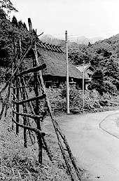 丹波の草葺屋根は急勾配の入母屋造り。棟に千木或いは鰹木を上げるところが多かった。棟に煙出しを設けた農家の中二階に蚕室があった。農家は天井のお蚕さんとともに月齢を重ね、繭をとり、製糸会社に納入したりその他の商人に売っていた。やがて、養蚕の凋落に歯止めがかからなると、蚕室は物置となり煙出しはふさがれた。由良川の段丘上或いはその支流の段丘などにそうした家屋や納屋が今も維持されている。草葺からトタン葺きに変わりはしたが、丹波の農家住宅は景観によく調和して美しいものだ。ときに草葺屋根に接すると、本当に心安らぐものがある。−平成19年− |