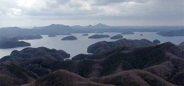溺れ谷の南北に上見坂公園など眺めのよい展望所が散在する。烏帽子岳(標高176メートル)展望所に立つと、眼下に浅茅湾の絶景に接することが出来る。累々と連なるちぎれ小島の島影から遣唐使船或いは遣新羅船の船影が浮かび消える錯覚を覚える。無双の景観であろう。−平成18年3月− |