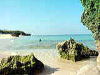 島一番の高み(標高94メートル)に与論城址が残る。城址から西方を眺めるとサンゴ礁の小山越しに海岸線を望むことができる。巾着のような凹部は与論港、その左右はリーフ。絶景である。