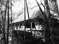 阿波の剣山麓の一宇村、木地屋の里では、下木家の主人が奥方と二人で奥座敷の囲炉裏端で新年を迎えている。戸口の左右に松とユズリハの葉を飾り、橙をつけた注連縄が上げてある。オセチのこんにゃくは、土間のいも釜に保存してあったこんにゃくだまから奥方が暮れにつくったもの。色は黒いがなかなかおいしそうである。 |