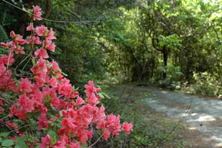 4、5メートルもあろうか、ウバメガシの樹冠の上で朱赤の花が咲いている。オンツツジだろう。枝の先に三枚の大きく丸い葉が輪生している。ミツバツツジの系統の花と思われるが葉と花が一緒に出て、花もずいぶん大きくく5、6センチはあるだろう。風にそよぐ薄い葉の上でふわふわと揺れている。傍らで、低木のメンツツジ(フジツツジ)が咲いている。男性的なオンツツジに対比した古人の命名であろう。葉のありようはオンツツジと非常によく似ている。