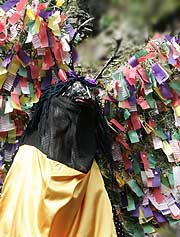 ツ鹿が一列になり、両脚を交互に上げ下げし祭神に鹿踊りを奉納。拝殿から2基の神輿が出て祭りの行列が整い、2キロほど先の御旅所に行幸。牛鬼、七ツ鹿、お猿、ダイバン(コウジンサマ、サクガミサマとも)、オタフク、獅子、神輿の行列が棚田がひらけた渓谷沿いの道を行く。牛鬼はブー、ブーと竹法螺を吹きつつ行列を先導。道中、氏子宅の玄関口から角の生えた頭をニューと差し入れる。氏子は家内安全、招福の神がきたと言って牛鬼を歓迎する。午後2時ころ御旅所に到着。祭壇を組み御饌を供え、祭り会場の準備が進む。この間、牛鬼、七ツ鹿は集落内を巡行し、それぞれ氏子宅で牛鬼を練り或いは鹿踊りを舞い、午後2時半ころ御旅所に到着。 |