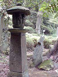 鳥居の左手に平地があってここには獅子城主鶴田越前守前の妻、妙香が逆修のため天正14年(1586年)8月に奉献した六地蔵塔並びに天正18年11月に建てられた読誦板碑(どくじゅいたび。写真左下燈籠の右手に見える)がある。妙香は賢の母であり読誦板碑と鳥居が母子によって同時に奉献されており興味をひく。板碑はもともと室園神社の別当寺に納められていたものが当地へ移されたものかもしれない。当時の世相や支配層の信仰生活を理解する上で貴重なものであろう。妙香の板碑の後ろにもうひとつ大きな板碑があるが、こちらの方は文字塔で神名の上に種子が刻してある。神仏混交の習いであろう。−平成17年8月− |
