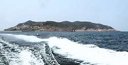 呼子の北西、3.5キロの海上に加唐島(かからじま)という島がある。呼子から定期船「かから丸」(写真左(に乗船して15分ほどで島の南部に開けた加唐港に着く。南北に細長く、周囲15キロメートルほどの島は半農